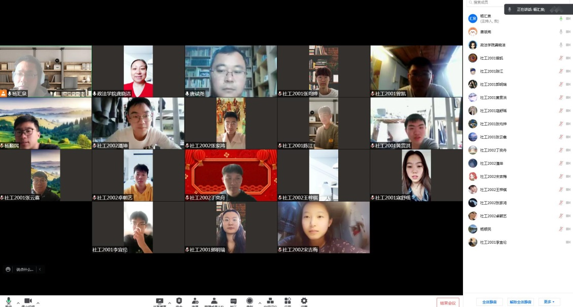 第六届青山杯社会工作大赛事务安排,并期望同学们能够积极配合各小组完成工作;然后,老师们对同学们线上提问、需求给予回复,并叮嘱重视认知实习,及时高效完成“青山杯”大赛宣传及各类事项,并在实践过程有所收获、提升自己。