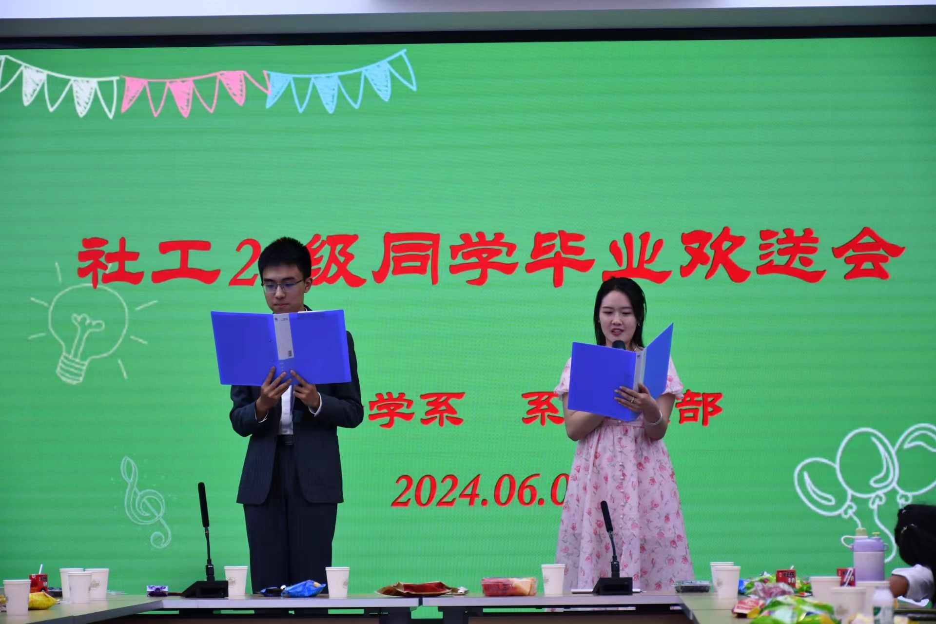 社会学系与系党支部在学校第五会议室举办社工20级毕业同学欢送会暨座谈会。学院党委书记李春慧,学院党委副书记、院长高功敬,学院团委书记刘晓娟,社工20级辅导员赵朔,社会学系教师,社工20级同学以及其他年级同学代表等参加。