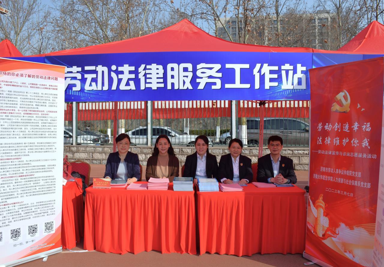 为加强大学生的劳动法律意识,维护高校毕业生的劳动就业权益,构建和发展和谐稳定的劳动关系,3月7日,人力资源与社会保障系(以下简称“人社系”)党支部与共建党支部——济南市劳动人事争议仲裁院党支部在“选择济南·共赢未来”2023年驻济高校毕业生就业双选会现场联合开展了劳动法律宣传与咨询志愿服务活动。济南市劳动人事争议仲裁院副院长张允明带队参加本次志愿服务活动,偷拍视频