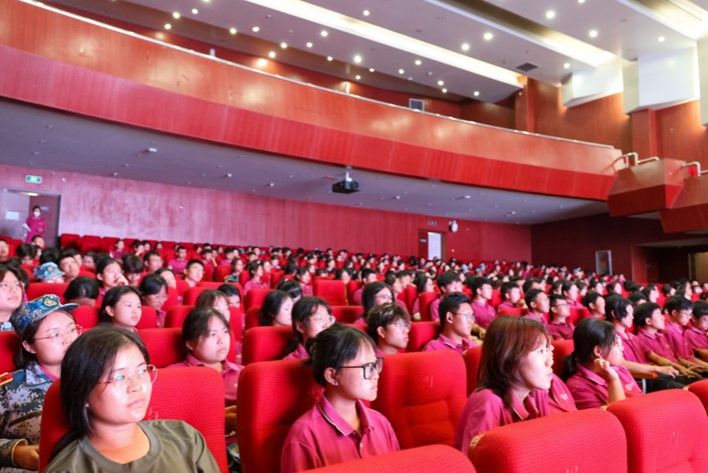 于学校大礼堂举行2023级新生入学教育第四讲。学生工作办公室主任黄茜、团委书记刘晓娟、教学管理办公室主任丁梁及全体辅导员出席本次活动,2023级新生共同参加。活动由2023级辅导员房仕琪主持。