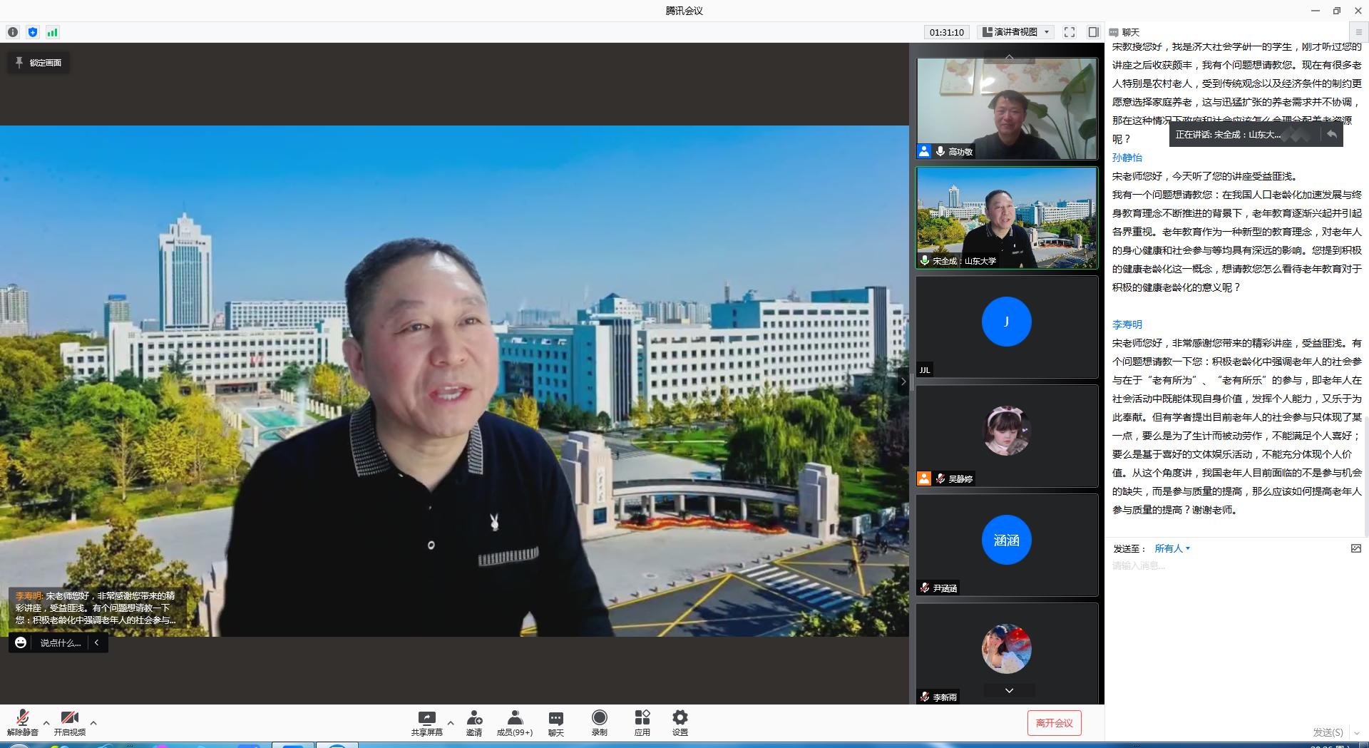 青龙山学术论坛暨社会学学科设立十五周年系列学术讲座于12月18日晚7点在腾讯会议平台线上举办,此次论坛邀请山东大学移民研究所所长、山东大学哲学与社会发展学院宋全成教授作题为《全球人口老龄化的最新理论回应》的学术报告,报告由高功敬教授主持,学院相关教师及社会学研究生共100余人线上参加。