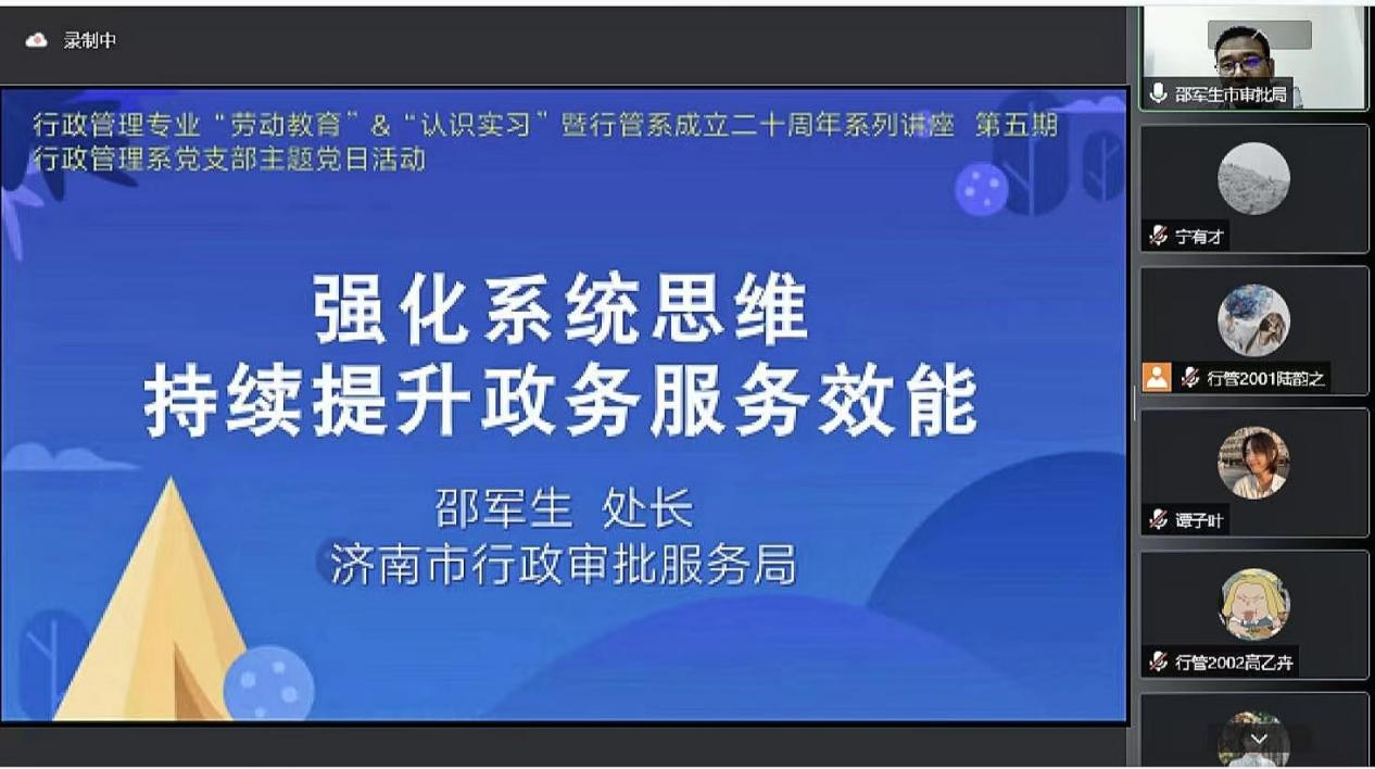 5月27日晚上,行政管理系“劳动教育”“认识实习”暨行管系成立二十周年、行管系党支部主题党日活动系列讲座第五期成功举行。本次讲座邀请到济南市行政审批服务局邵军生处长做《强化系统思维,持续提升政务服务效能》的主题报告。偷拍视频