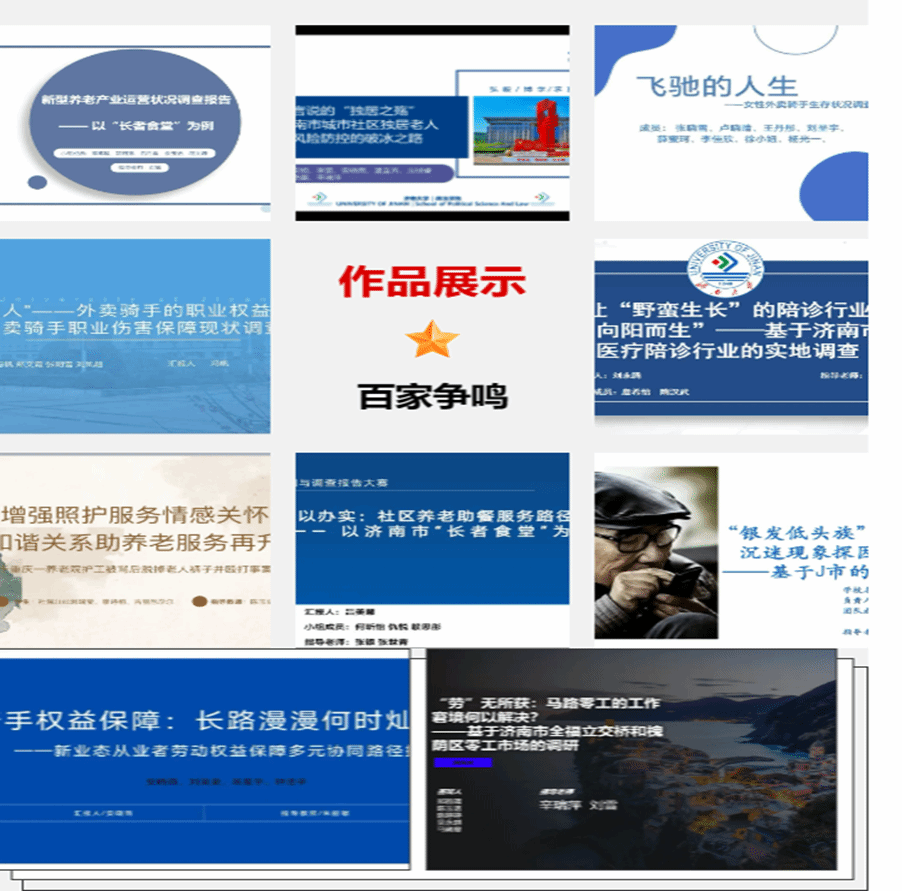 随后,各参赛团队有序汇报,评委老师围绕选题创新性和可行性、框架结构、研究方法、格式规范等方面提出有针对性的修改建议和意见。本次大赛共有十支队伍参赛,调研和分析的领域涉及马路零工生存状况、外卖骑手权益保障、独居老人居住风险、银发低头族的成因、养老照护、社区养老助餐服务、陪诊服务、新型养老产业等方面。