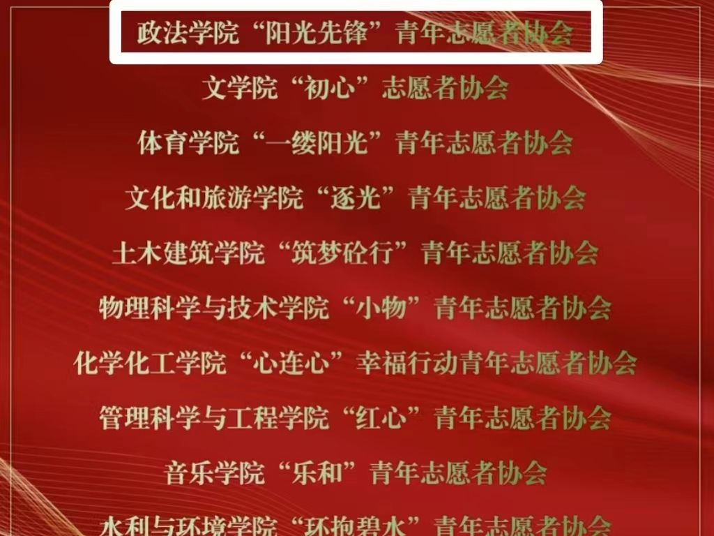 阳光先锋青年志愿者协会自成立以来积极投身爱心支教、扶弱助残、普法宣传、科普教育、社区服务、环境保护、校内服务等志愿服务。无论是关爱退伍军人的拥军优属活动,还是扶弱助老助残活动,亦或是趣味科普活动和普法活动,都充分展现了政法青协对志愿服务精神的深刻理解和践行。政法青协的优异表现多次被省市级媒体争相报道,其影响力不断扩大,更是在2023年入选了两弹一星宣讲团、井冈山精神志愿宣讲团、法治中国志愿宣讲团、“中国历代绘画大系”全国大学生志愿宣讲团和全国千支大学生志愿宣讲团,且连续多年荣获偷拍视频