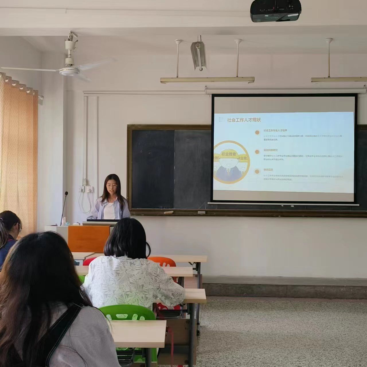 分享会上,社工本科生首先从社会工作的专业认同和职业认同两个方面结合自身做了详细的概述。紧接着,社工研究生同学则对文献内容进行了系统性的梳理与整合,从多因素的积极作用对学生职业选择形成正向的调节、职业环境和社会环境的消极作用等方面对社会工作专业本科生职业选择进行了全面而深入的剖析。