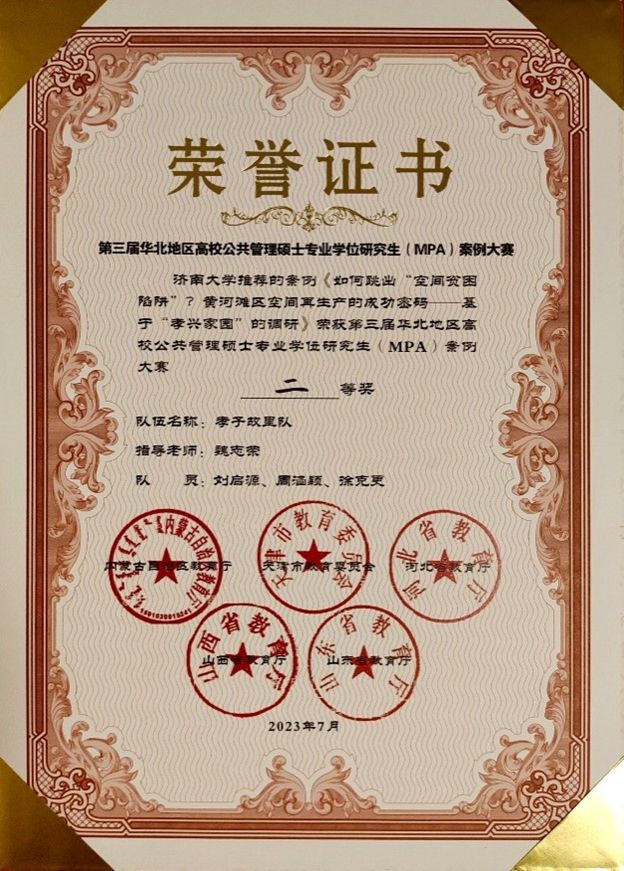 魏志荣老师指导的“孝子故里队”(队员:刘启源、周涵颖、徐克更)参赛案例《如何跳出“空间贫困陷阱”?黄河滩区空间再生产的成功密码》在前期举办的“第三届山东高校公共管理硕士专业学位研究生(MPA)案例大赛”中荣获佳绩,被推荐参加本次大赛。经过一天的激烈角逐,我校“孝子故里队”最终取得小组赛第4名、大赛二等奖的优异成绩。