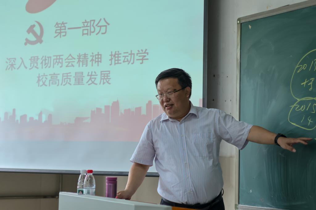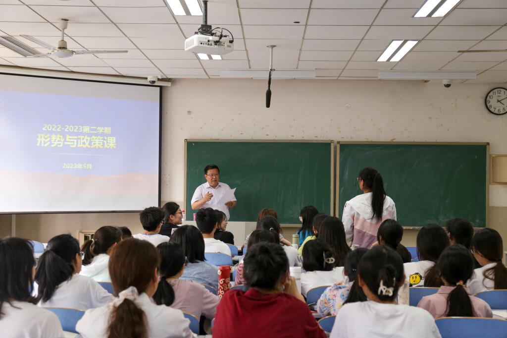 徐部长从深入贯彻两会精神、推动学校高质量发展;开展主题教育,坚持学思用贯通、知信行统一;增强安全意识、创建平安校园;加强党风廉政建设、深入推进全面从严治党四个方面展开讲解,立足国情、社情、校情,结合学生专业特色,用生动的语言、鲜活的案例、深刻的道理,引导同学们深刻领悟“两个确立”的决定性意义,增强“四个意识”、坚定“四个自信”、做到“两个维护”,深入学习宣传贯彻全国两会精神和党的二十大精神,贯彻落实学校第四次党代会确定的目标任务,推进学习贯彻习近平新时代中国特色社会主义思想主题教育走深走实。课堂上,师生互动交流深入、课堂气氛热烈融洽,最后十分钟,徐部长与同学们围坐在一起,同学们围绕学校发展、学院建设、学科专业、个人规划提出自己关心的问题,徐部长耐心细致地一一回答,切实解答同学们学习、工作、生活中的问题。同学们纷纷表示收获颇丰,作为新时代青年一定要牢记党的教诲,不负韶华,不负时代,关注学校和学院发展,在青春的赛道上奋力奔跑,争取跑出当代青年的最好成绩。
