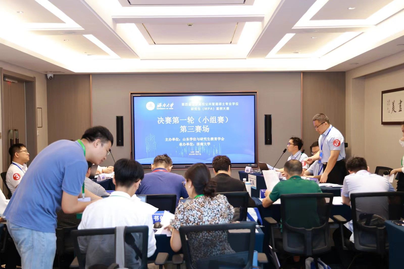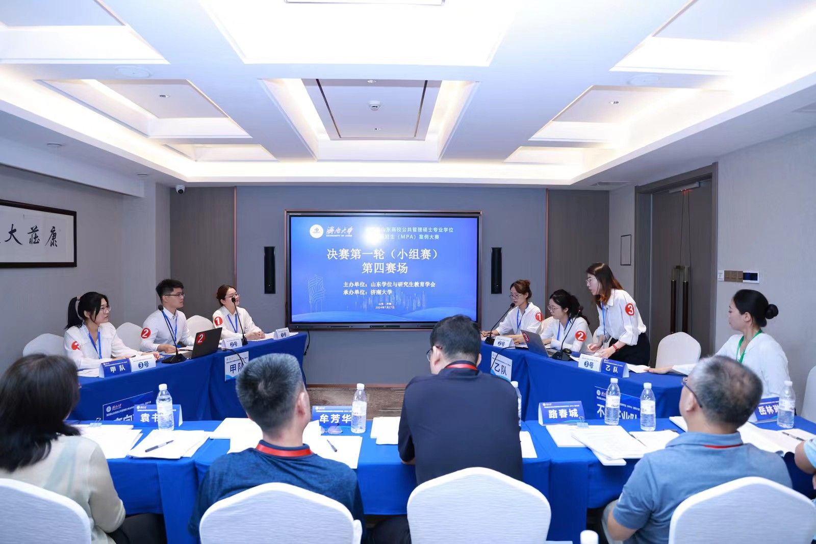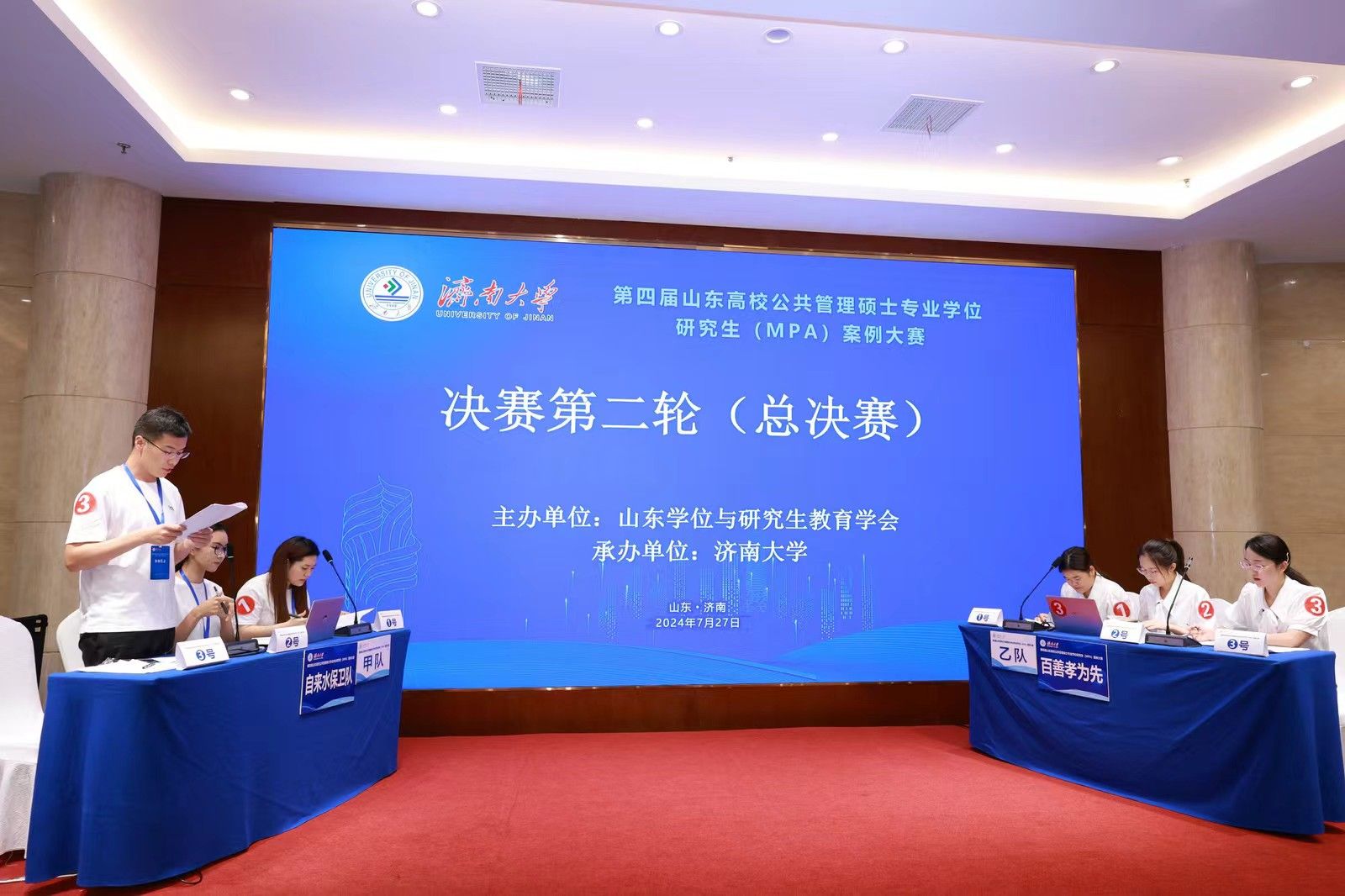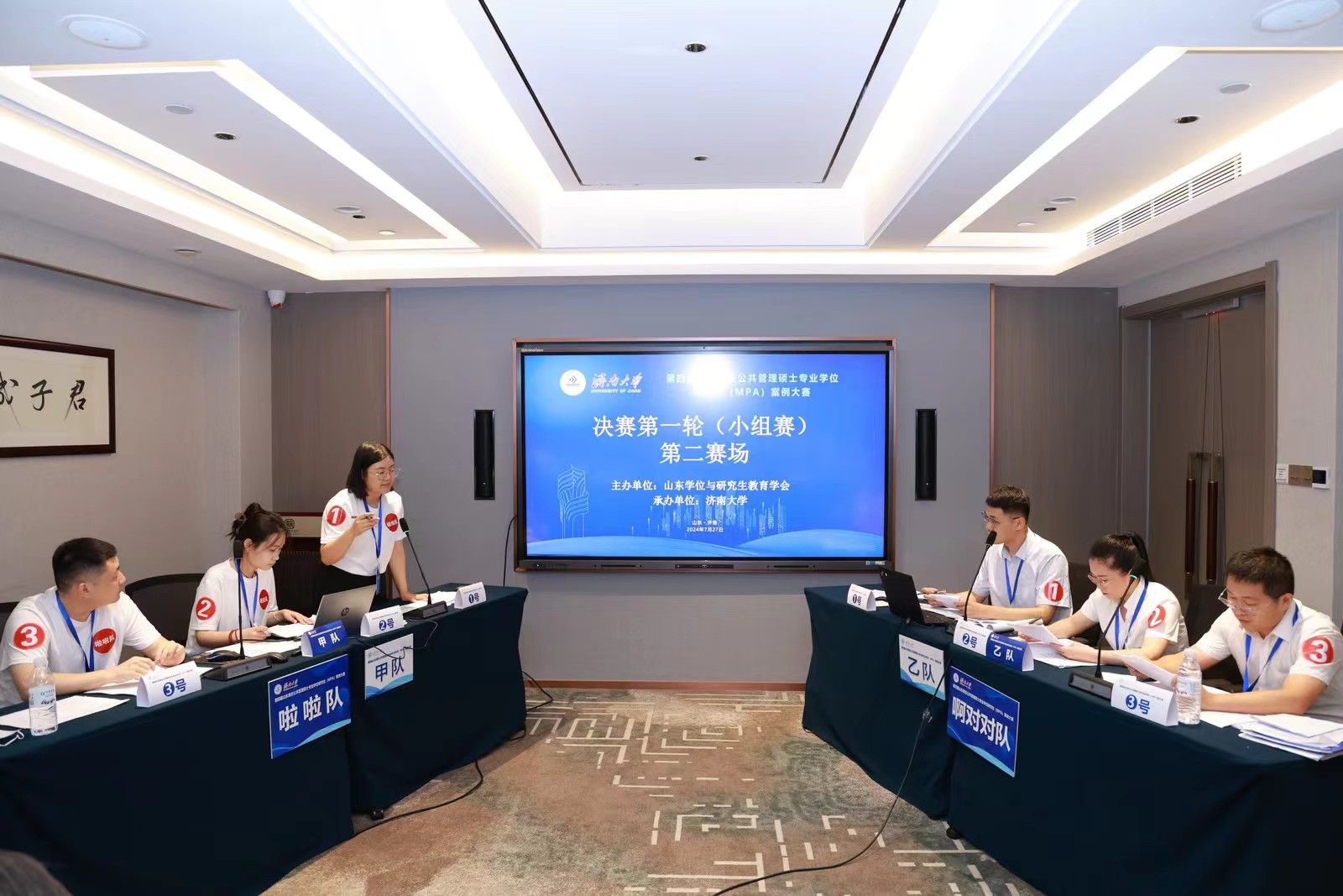 决赛分为小组赛和总决赛两个环节。7月27日上午为小组赛,分为四个赛场同时进行。24支参赛队伍通过抽签确定赛场和对手,每个赛场6支队伍、两两对决。比赛双方现场展示案例正文及分析报告,并进行自由辩论、总结陈述。评委根据每支队伍的案例采编及分析质量、专业水平和比赛表现进行现场评分。经过一上午的激烈比赛,来自山东大学、山东师范大学、曲阜师范大学和偷拍视频
