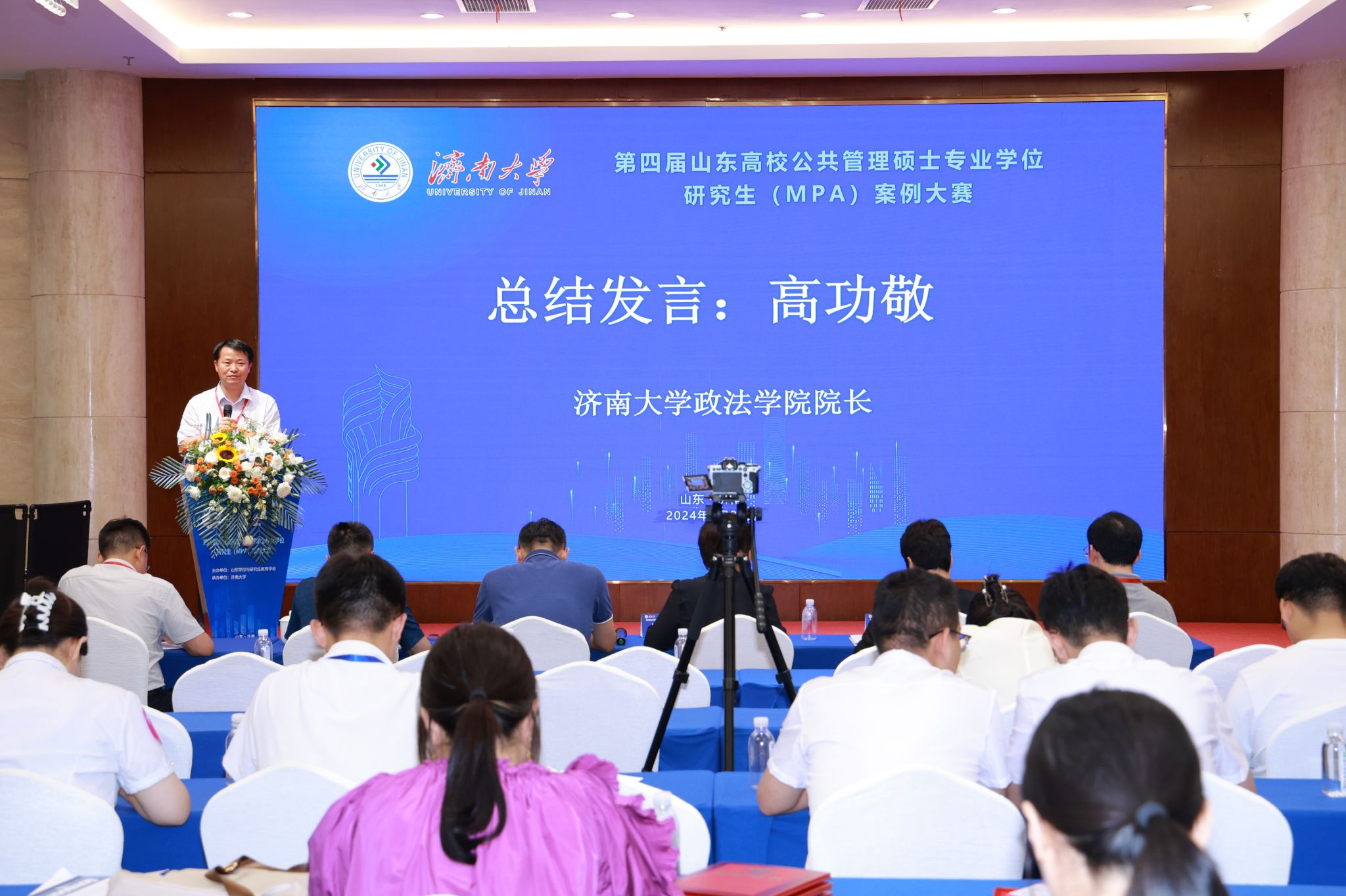 胡康在致辞中简要介绍了山东省公共管理硕士专业学位研究生(MPA)培养单位设置情况以及在推动公共管理领域发展方面所取得的成就。希望越来越多的公共管理专业硕士研究生和教师参与案例大赛,共同挖掘和展示山东省公共管理领域的真实案例,提出富有创新性的理论洞见与实用性的治理解决方案,为新时代善治之路提供更多思想动力与实证参考。最后向与会高校的各位领导、专家和师生,承办方偷拍视频