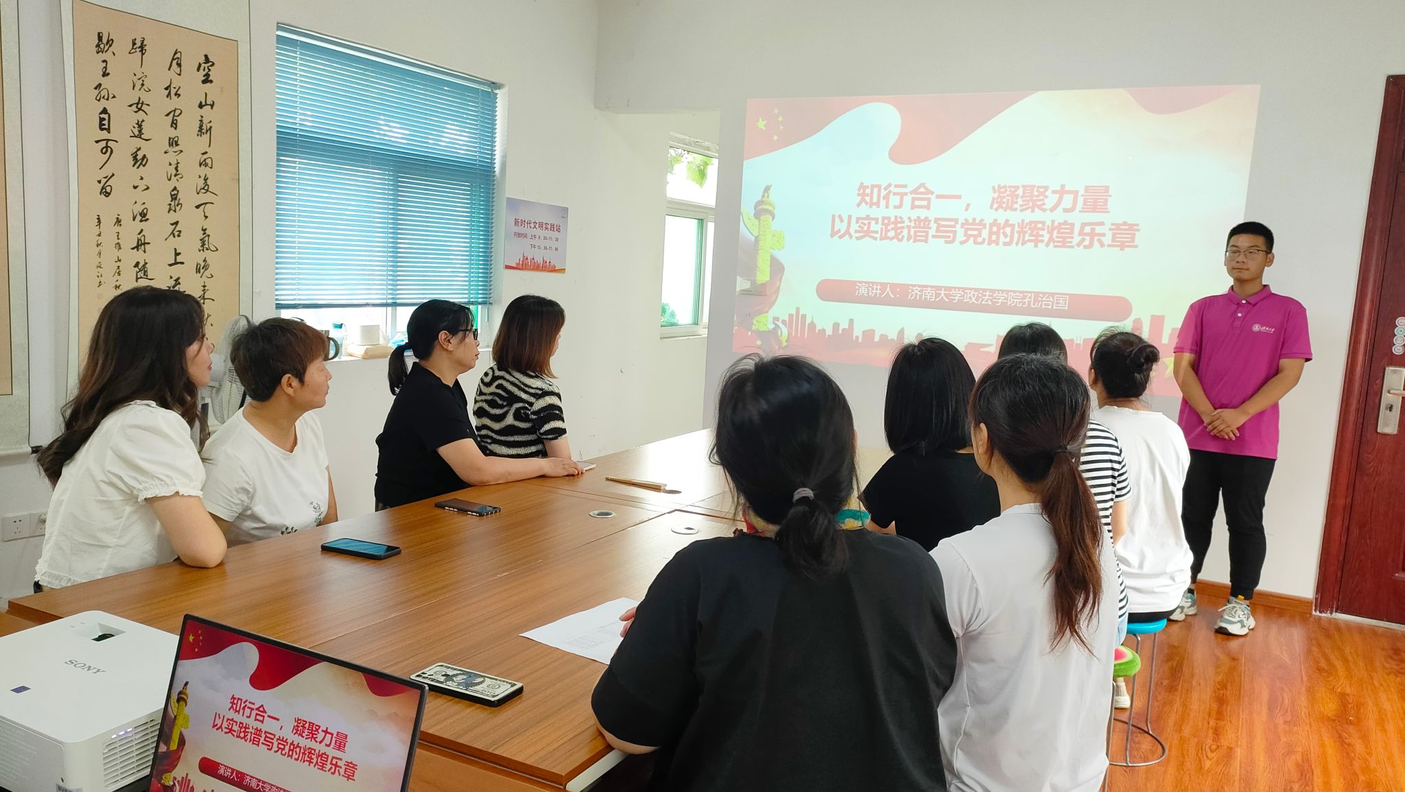 “弘政情法意,话青春未来”暑期理论宣讲团的学生宣讲员进行党课宣讲。