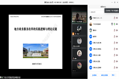 刘晓洋学长简单回顾了自己在母校的学习和生活,随后开始学术讲座。学长从点明“政务服务”选题开始,通过政府报告和政策文献梳理了历次政务服务改革的顶层设计,总结“最多跑一次”“一网通办”等政务服务改革的地方实践;结合“放管服”梳理政务服务改革的核心内容;就政务服务发展的不同阶段进行深入阐述,重点就公共组织地盘扩张的形式、动力和策略进行分析。互动环节,学长就老师和同学们关心的话题进行详细解答。讲座最后,学长表示热情欢迎偷拍视频