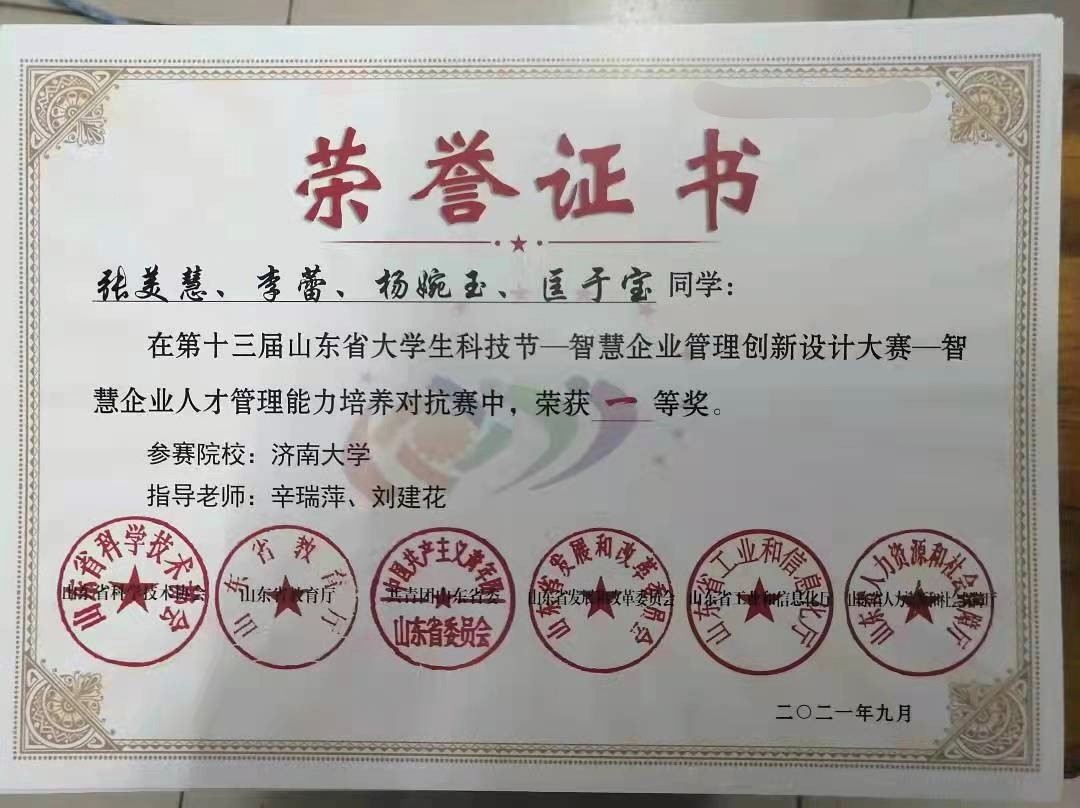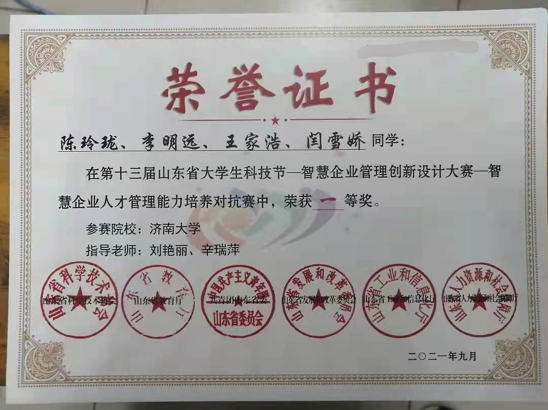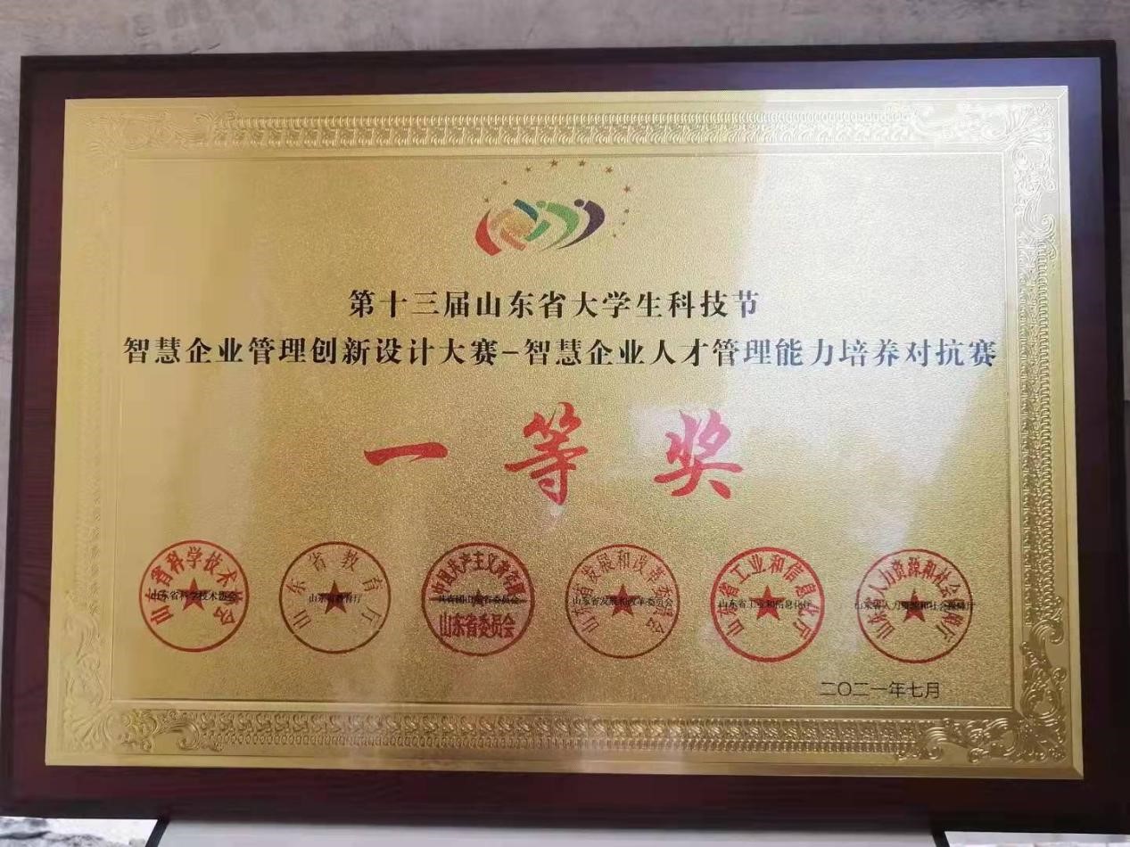 人力资源与社会保障系19级、公管20级部分同学参加了由山东省教育厅、山东省人力资源和社会保障厅、共青团山东省委员会、山东省发展和改革委员会等单位联合主办的2021年第十三届山东省大学生科技节智慧企业管理创新设计大赛-智慧企业人才管理能力培养对抗赛决赛(线上)。
