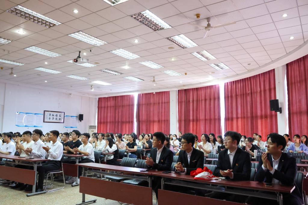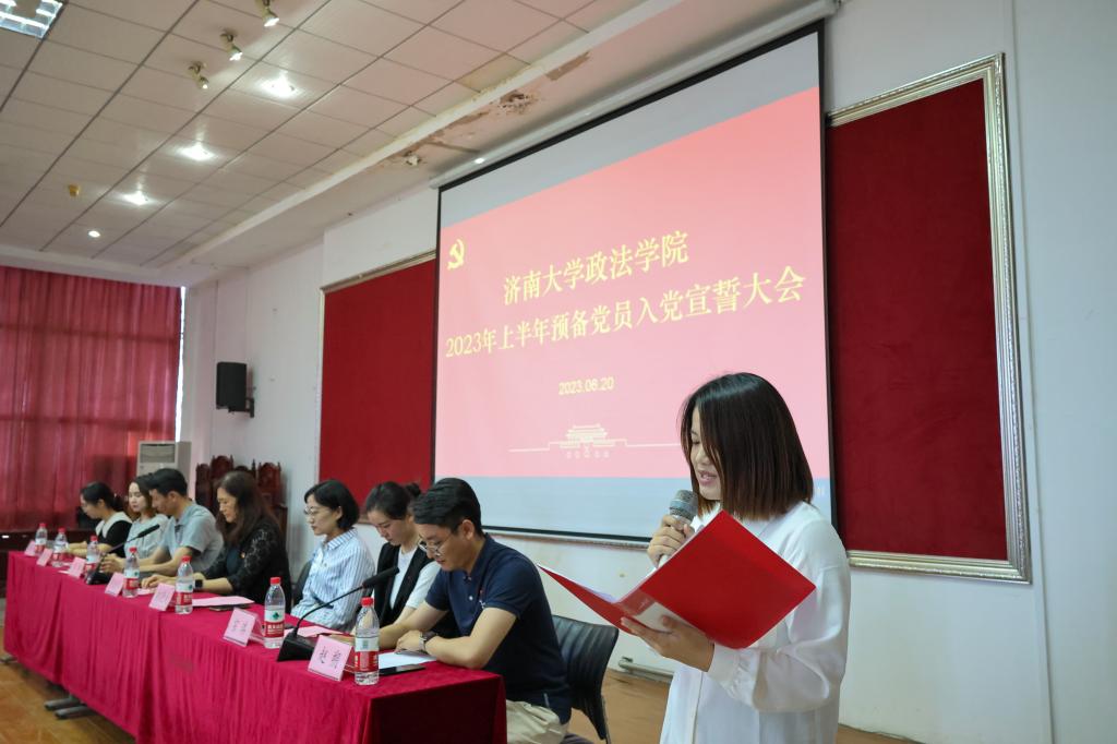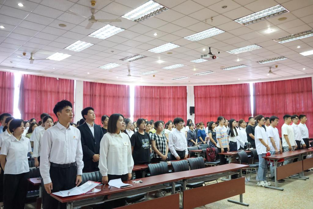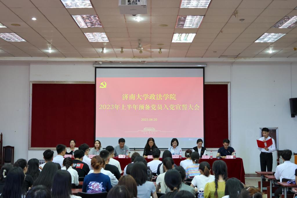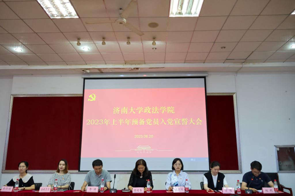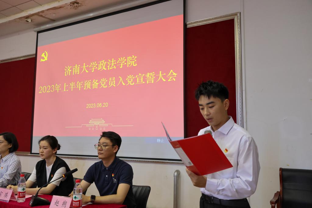 党委在第四教学楼模拟法庭召开2023年上半年预备党员入党宣誓大会。学院正处级组织员国迎春,学院党委副书记、副院长李涛,团委书记刘晓娟,公共管理学生党支部书记迪妮尕尔·艾尔夏提,法学学生第一党支部书记宗琪,法学学生第二党支部书记房仕琪以及新发展的预备党员参加会议。会议由思想政治教育学生党支部书记赵朔主持。