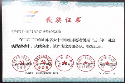 第十一期“青年马克思主义者培训工程”学生骨干培训班(以下简称青马班)在2020年山东省大中专学生志愿者暑期“三下乡”社会实践活动中表现优异,获评“优秀服务队”称号,学员何福龙、王淑杰、王杰、栾雯晶、陈方昕在2020年山东省大中专学生志愿者暑期“三下乡”社会实践活动中被评为优秀学生。