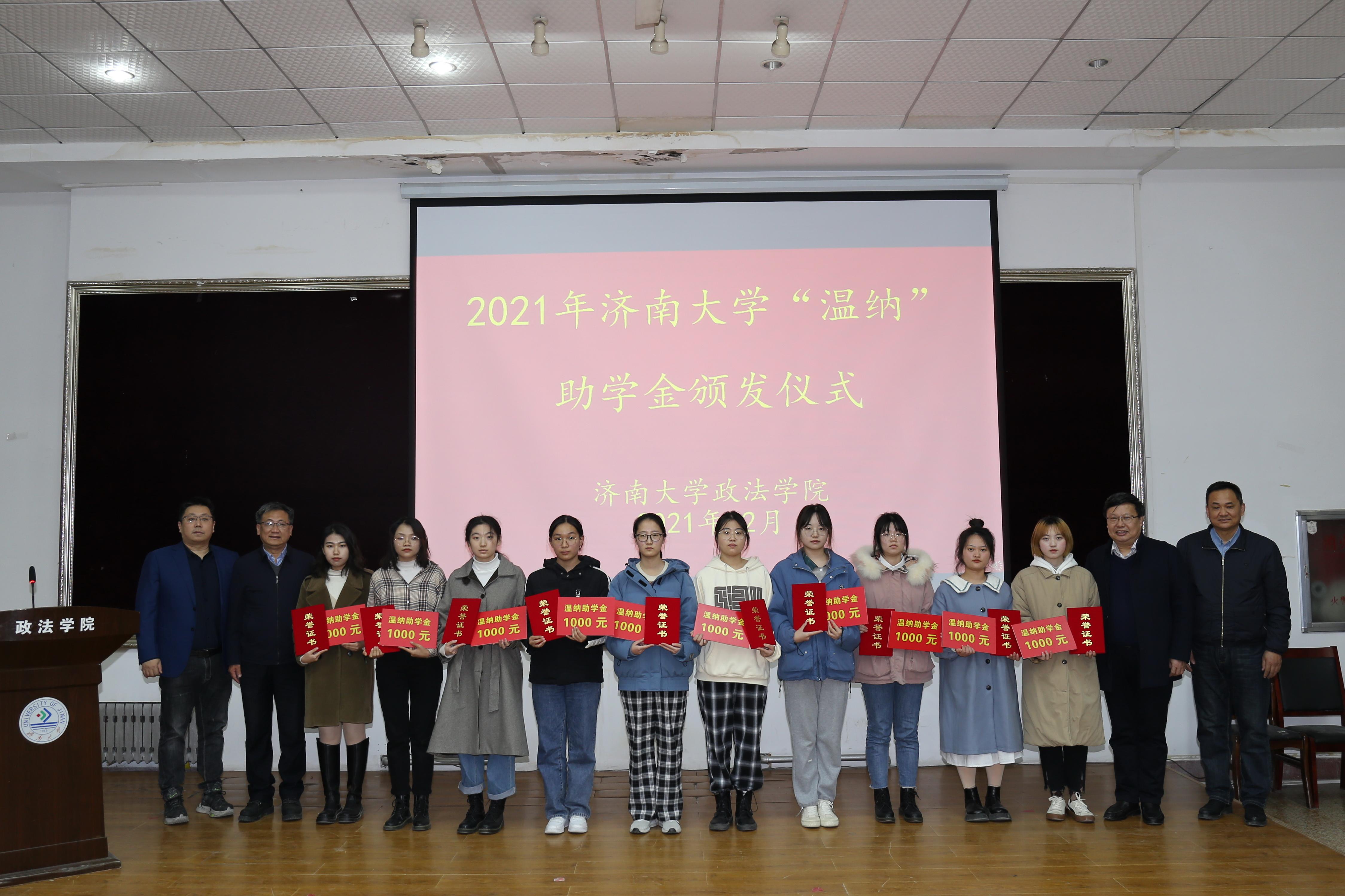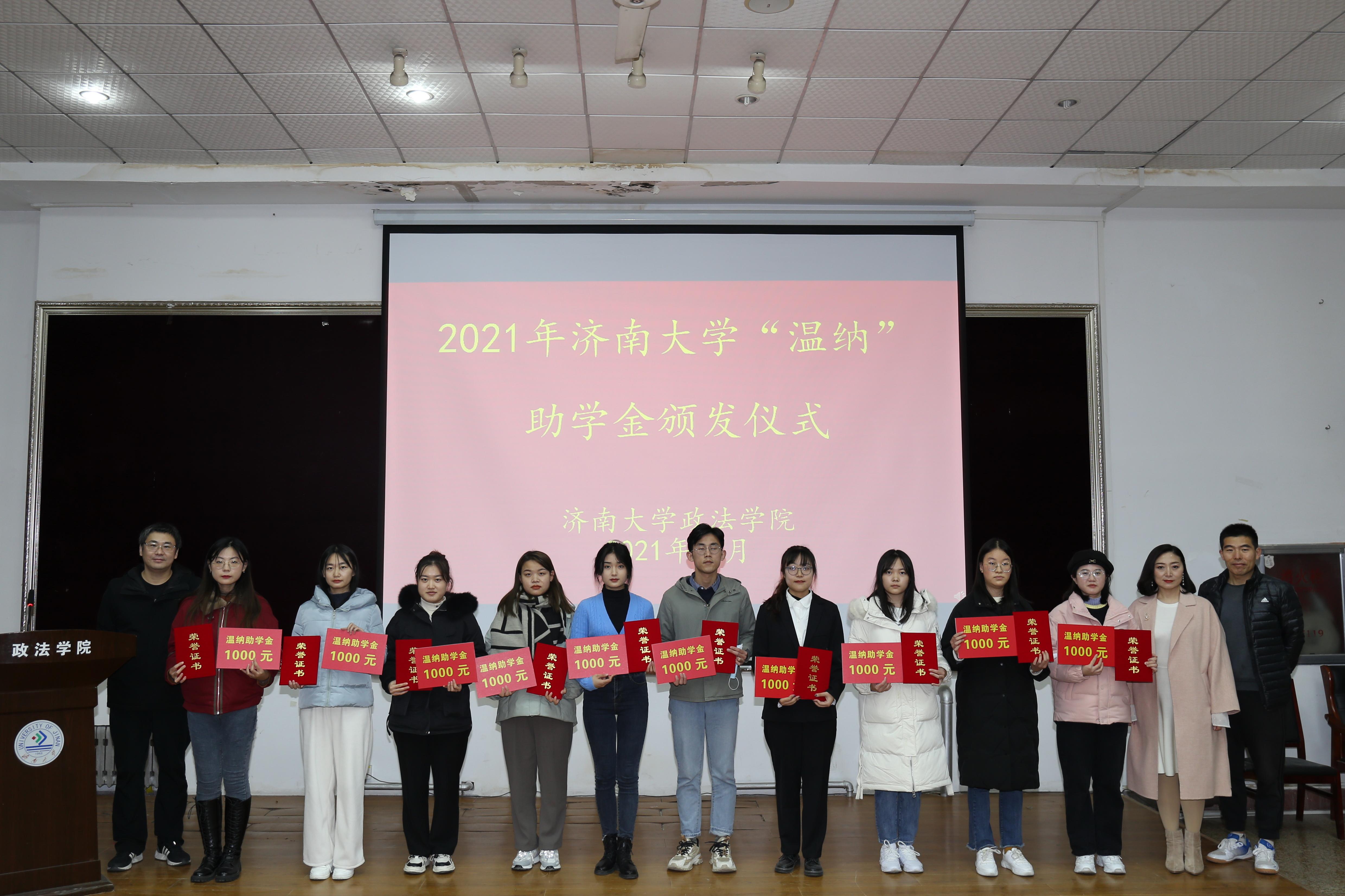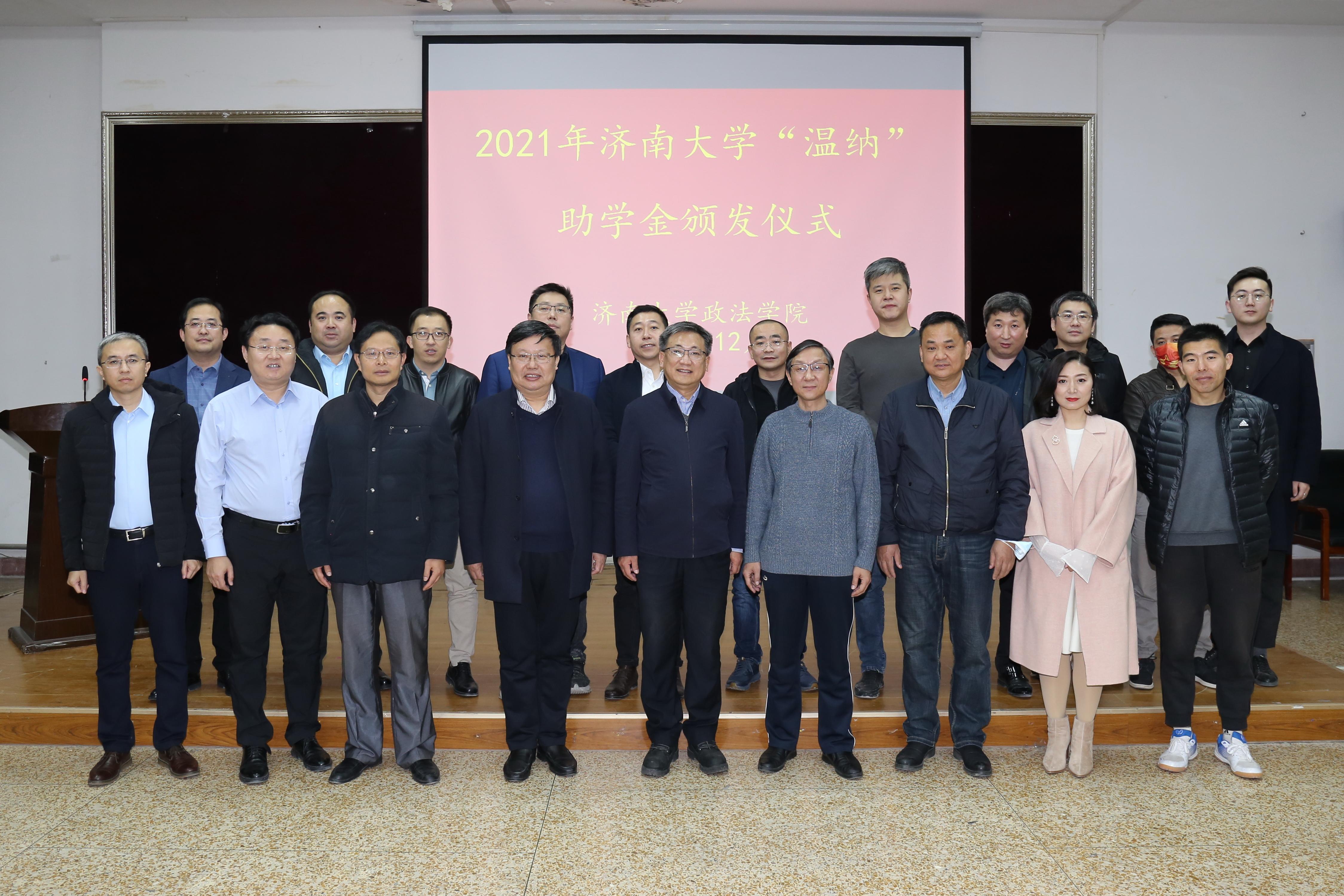 党委副书记、副院长于龙泉主持,仪式上,学校合作发展处副处长李仲涛代表“温纳助学金”评审委员会宣读了表彰决定,法学2019级学生王婕作为获奖代表向学院和校友企业表示感激,山东温纳律师事务所主任武磊向获得助学金的同学表示祝贺,与会嘉宾为首批获得助学金的三十位学生颁发了获奖证明。