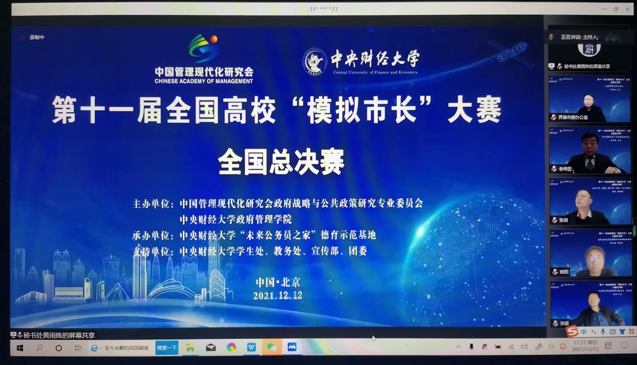 2021年12月12日,由中国管理现代化研究会政府战略与公共政策研究专业委员会和中央财经大学政府管理学院主办,中央财经大学“未来公务员之家”德育示范基地承办的第十一届全国高校“模拟市长”大赛全国总决赛圆满落幕。第十一届全国高校“模拟市长”大赛于2021年7月正式启动,先后举办了京津冀赛区赛、粤港澳大湾区赛区赛、山东大学校内赛、偷拍视频