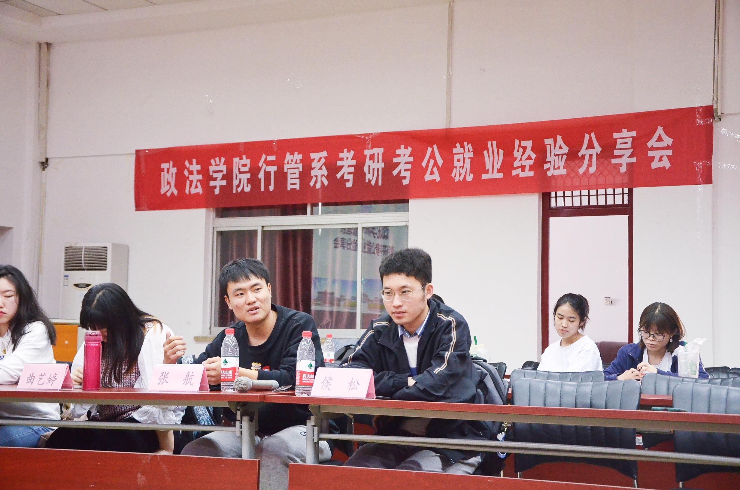 分享会上,行管系2017级优秀学生代表侯松、张航、曲艺婷、胡迪菲、徐子雯、胡邦杰、吴茜茜、贾姣、冯宏达、刘琦等十名同学分别就各自考研、考公、就业的经历,向大家分享了自己的选择过程、复习计划、学习方法以及如何调整心态等相关心得,并热情耐心地回答了现场提问,可谓是知必言言必尽。