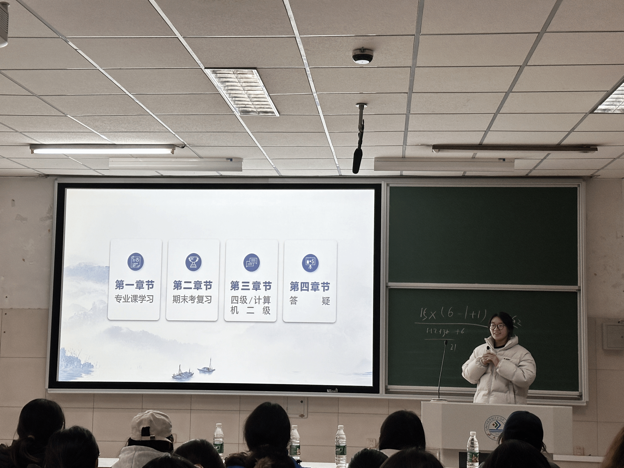 2021级张童童同学聚焦保研规划、推免流程等进行经验分享,并鼓励新生同学们在大学初期抓住机会,积极参与各类竞赛等活动,以拓宽视野,增强综合素质。2022级巩昱杰同学依据自身丰富参赛经历,就专业竞赛、社会实践、科创比赛等提出切实建议,指出项目选择需紧密结合专业所学与个人兴趣,并充分考量对未来职业发展的潜在助力,积极鼓励同学们踊跃投身各类竞赛。2023级马文菲、邢廷凤同学针对大一学年学习规划、期末复习策略、课余生活安排等提出建议,并以诙谐幽默的表达有效舒缓同学们的期末备考压力,助力其以从容心态应对期末考试。