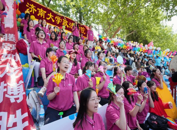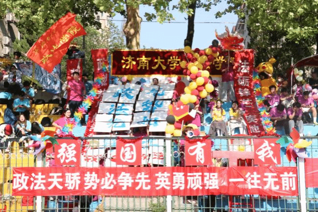 开幕式上,政法方阵以"法韵政风,飞扬青春"为主题惊艳亮相。学院师生方阵步伐铿锵、口号嘹亮,以整齐划一的队列和独具特色的创意表演,赢得了全场师生的阵阵掌声。学生团体操队伍以灵动优美的动作和朝气蓬勃的精神面貌,为开幕式增添了一抹亮色;观众席上,政法学子文明观赛,热情呐喊,为运动员们注入了无限动力。赛场上的每一步都镌刻着政法人奋勇拼搏的钢铁意志,场外的每一声呐喊都彰显着济大人的使命和担当!