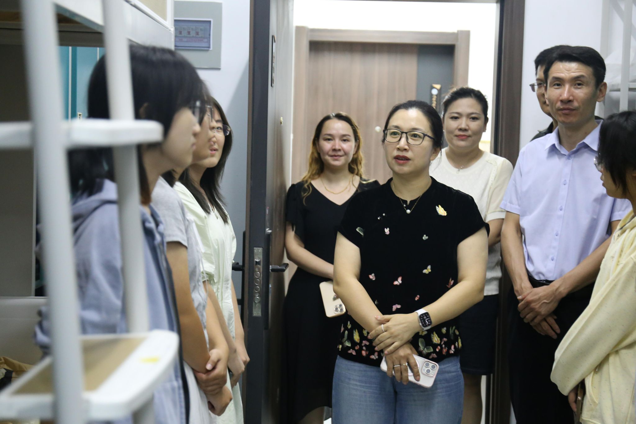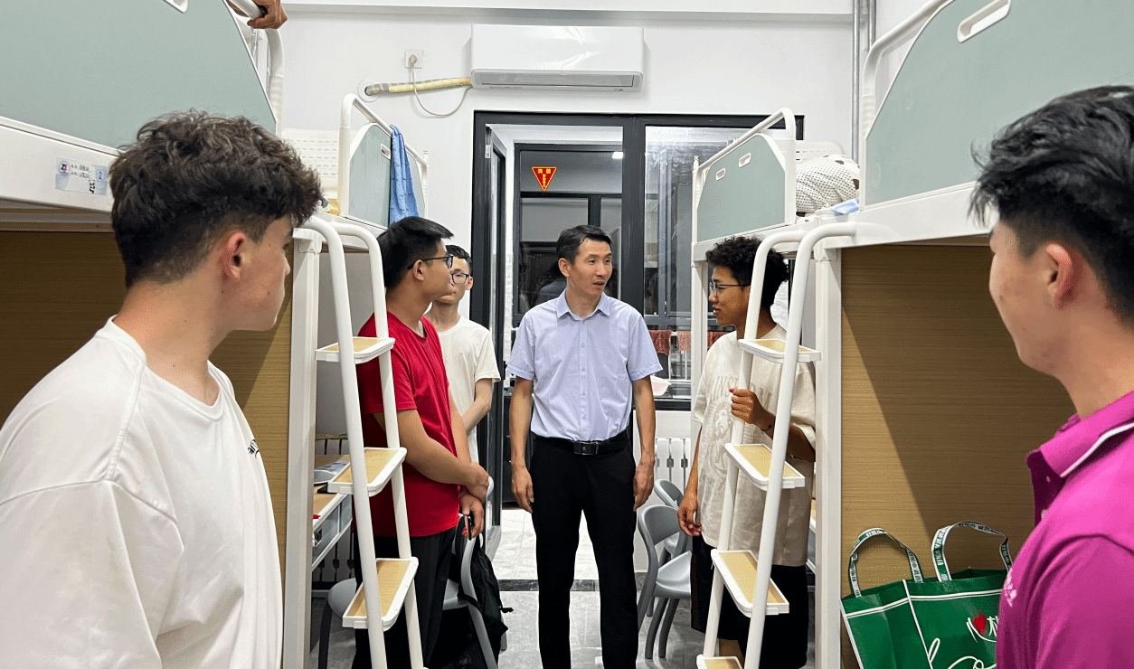 夜色渐深,关怀更暖。迎新报到当晚,学院党委书记李春慧、党委副书记李涛与辅导员一行深入新生宿舍,与大家亲切交流,细致询问住宿、饮食等情况,倾听入学感受,并围绕课程学习、社团活动与校园服务等问题一一耐心解答。走访中,老师们还介绍了学院的学科特色、培养目标和校园安全须知,鼓励新生早日适应环境、明确学业目标。