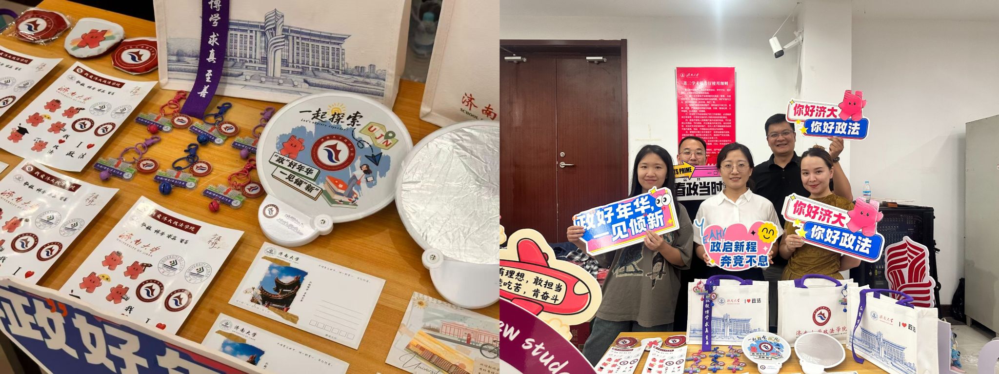 学院以文创传递迎新温情,将“器以载道”化作贴心问候。定制手提包选用“济大蓝”,伴青春一路同行,校训与院徽相映,寄语学术理想;钥匙扣镌刻图书馆与升华广场,寓意推开知识之门、走上成长阶梯;折叠扇上,吉祥物“政小法”笑意相迎,以灵动一抹点亮探索之心;政法贴纸则容每一位新生意趣表达,融入从指尖开始。这一份份融入日常的礼物,承载的是学院的用心与欢迎,于细微处滋养爱校荣院之情,传递出深厚的育人温度。