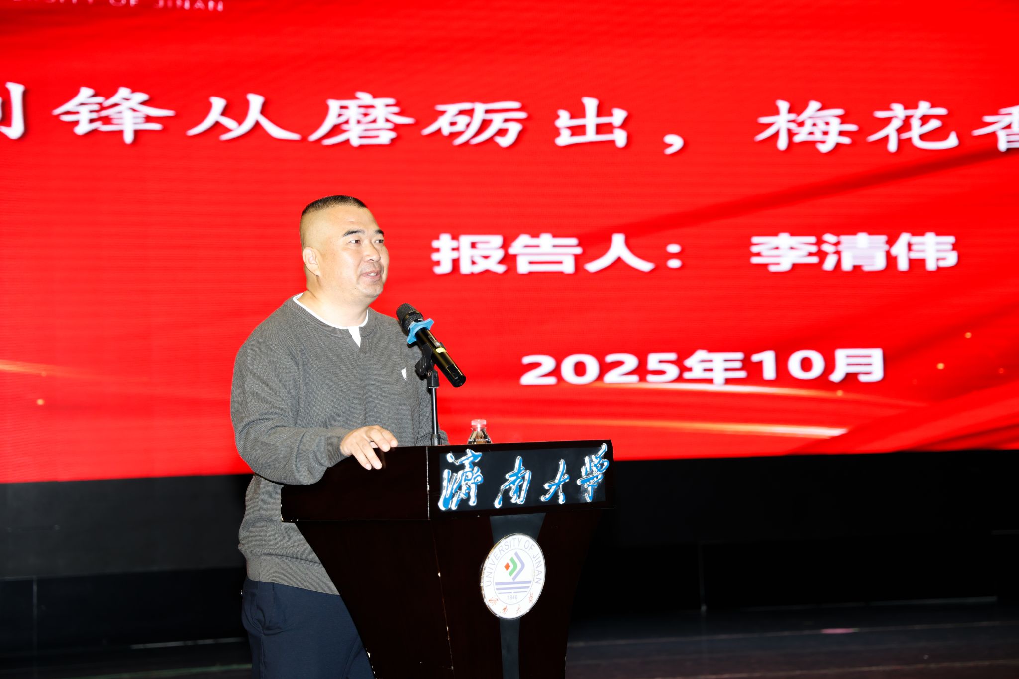 学院优秀校友代表2002级社会工作专业李清伟,以“宝剑锋从磨砺出,梅花香自苦寒来”为题,为在场新生作了一场生动深刻的主旨报告。他深情回顾了在校期间担任学生干部、积极参与各类实践并多次获得荣誉的成长岁月,强调正是这些经历锤炼了他沟通协作、组织管理与抗压耐挫的核心能力,为日后发展奠定了坚实基础。毕业后,他并未止步于安稳,在企业经理的岗位上积累了丰富的行业洞察与管理经验,继而勇敢踏上自主创业之路,成功创立并壮大了青岛捷康达物流有限公司。校友的求学奋斗历程,为新生传递了坚持与奋斗的力量,成为新生成长路上的“鲜活榜样”。