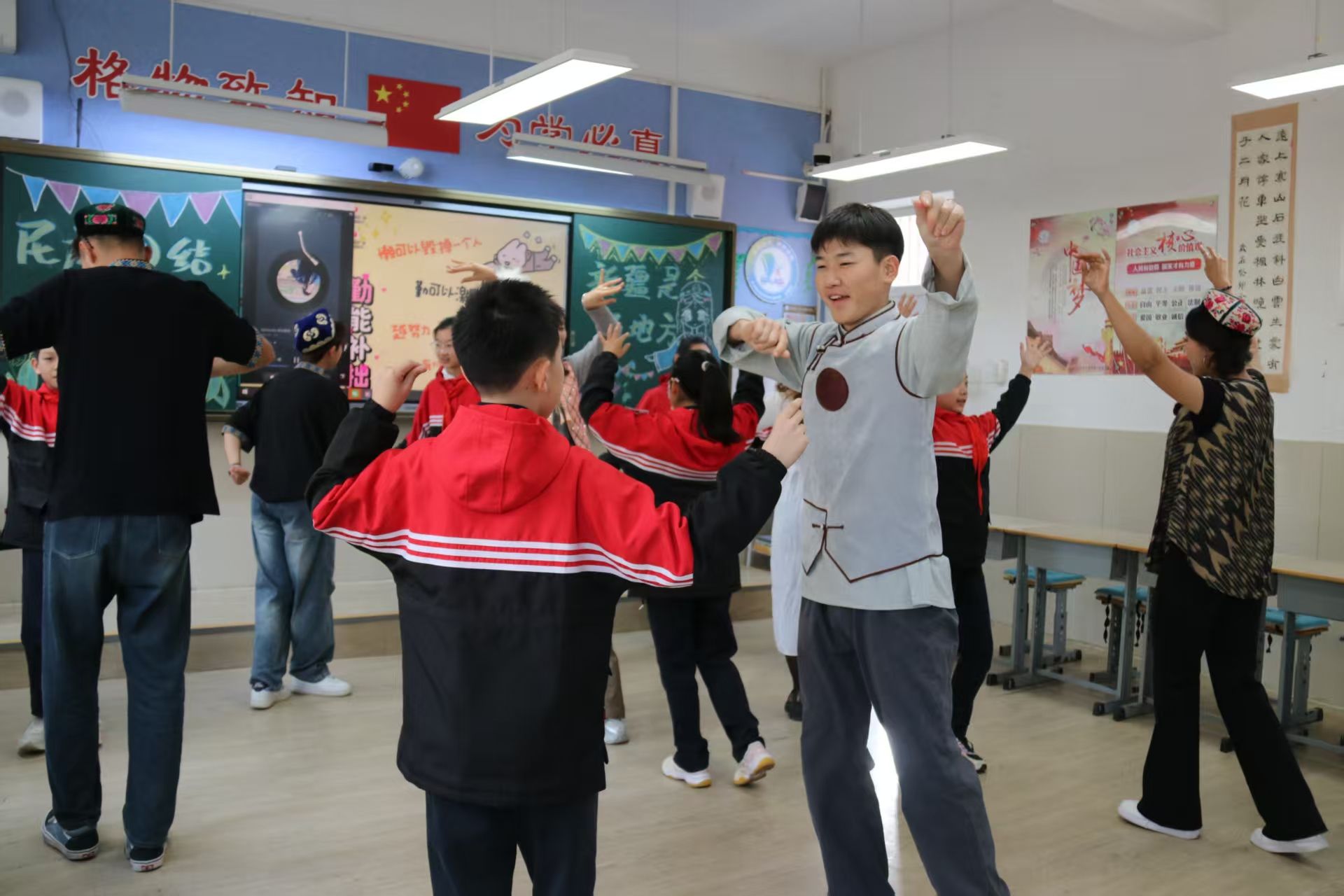 志愿者以新疆各民族文化为切入点,通过丰富多彩的形式向小学生们生动地介绍了新疆各民族特色文化,让孩子们直观感受各民族文化的独特魅力。“维吾尔族的小花帽都有哪些花纹?”“小朋友们认识姐姐手上的民族乐器吗?”“蒙古族的那达慕大会都有哪些项目?”课堂中穿插趣味问答,孩子们纷纷举手抢答,现场气氛热烈。文化展示后,志愿者们为小朋友们带来了才艺展示,维吾尔族的舞蹈、哈萨克族的黑走马、蒙古族的江格尔一一呈现。随后,志愿者们分组教小朋友们跳民族舞蹈、讲简单的民族语言和体验弹奏民族乐器。一张张真诚的笑脸,一双双挥动的小手,一阵阵灵动的旋律,构成了各民族交往交流交融最动人的画面。这一刻,宣讲课变得更加生动和直观。不同的民族,同一种心跳,“大学生”与“小学生”的距离更近了,志愿者们结合新疆的汉族与少数民族共居的实际,告诉小朋友“身边的各民族伙伴都是一家人”,引导大家理解“中华民族多元一体”的内涵,懂得尊重不同民族的风俗习惯。