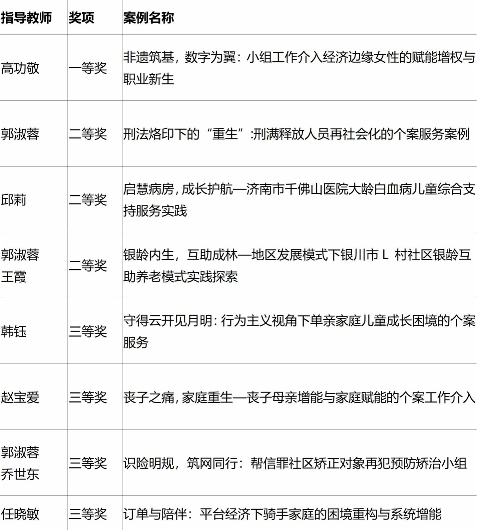 的大力支持和系统筹备。自大赛筹备以来,学校及学院均高度重视,通过举办“青山杯”社会工作案例大赛遴选优秀作品,并配备专业指导教师团队,从案例选题、文本打磨到现场展示进行全流程指导。其中,高功敬院长指导的《非遗筑基,数字为翼:小组工作介入经济边缘女性的赋能增权与职业新生》案例,因聚焦弱势群体帮扶、融合非遗传承与数字技术创新,凭借鲜明的时代性和扎实的实践成效荣获一等奖。其他团队在本次比赛中亦有出色的表现,我校在此次大赛中的获奖明细如下: