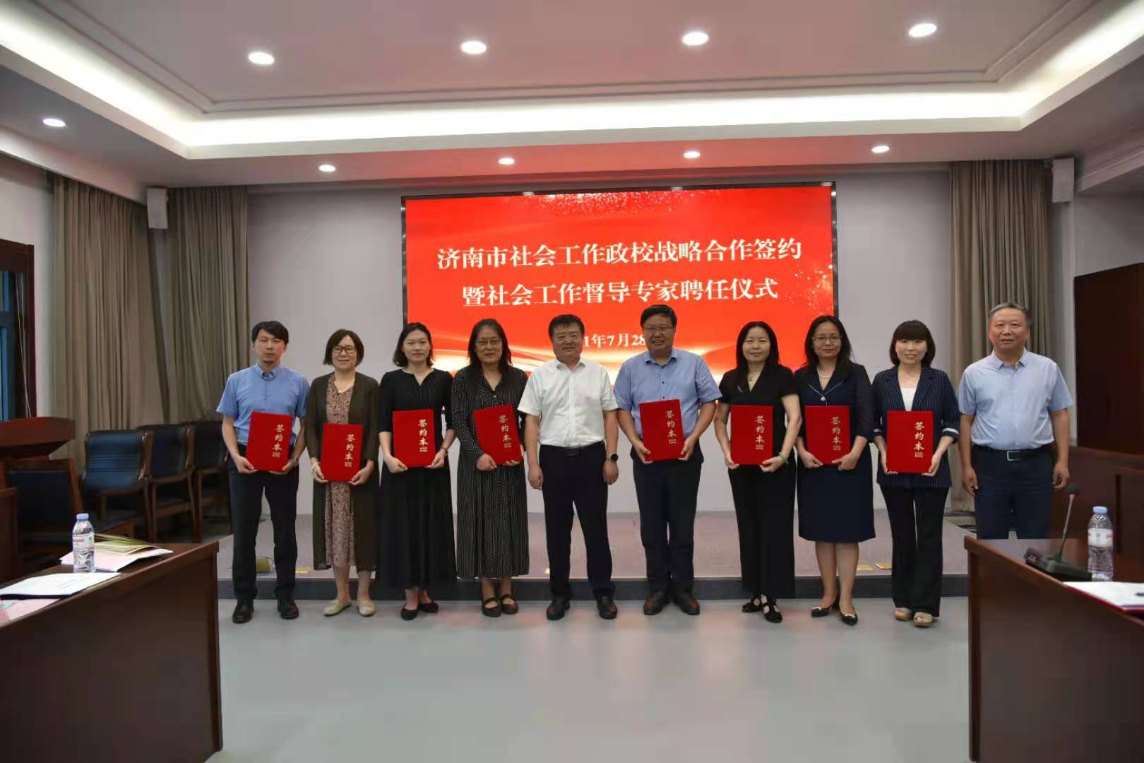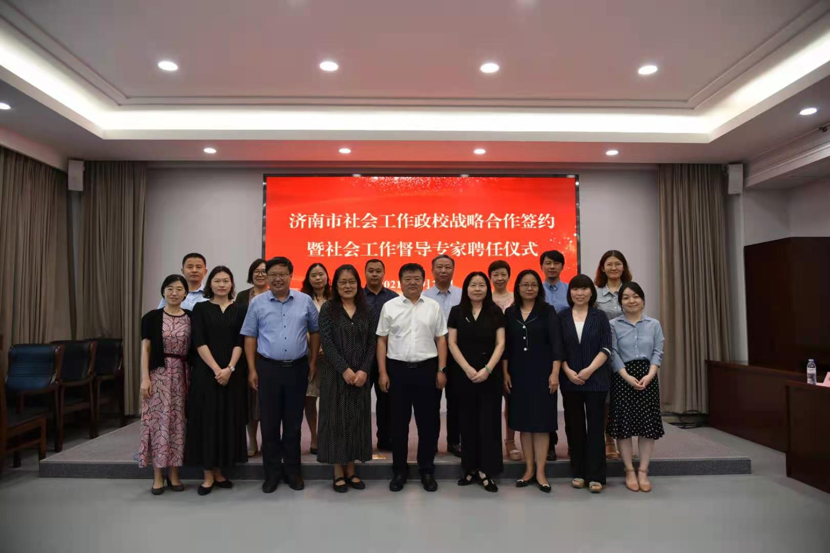 、山东大学、山东建筑大学、山东财经大学、山东女子学院、齐鲁师范学院、山东青年政治学院、山东管理学院的8位高校代表签订了《济南市社会工作政校战略合作协议》,这标志着济南市社会工作专业建设有了新的平台和“根据地”。