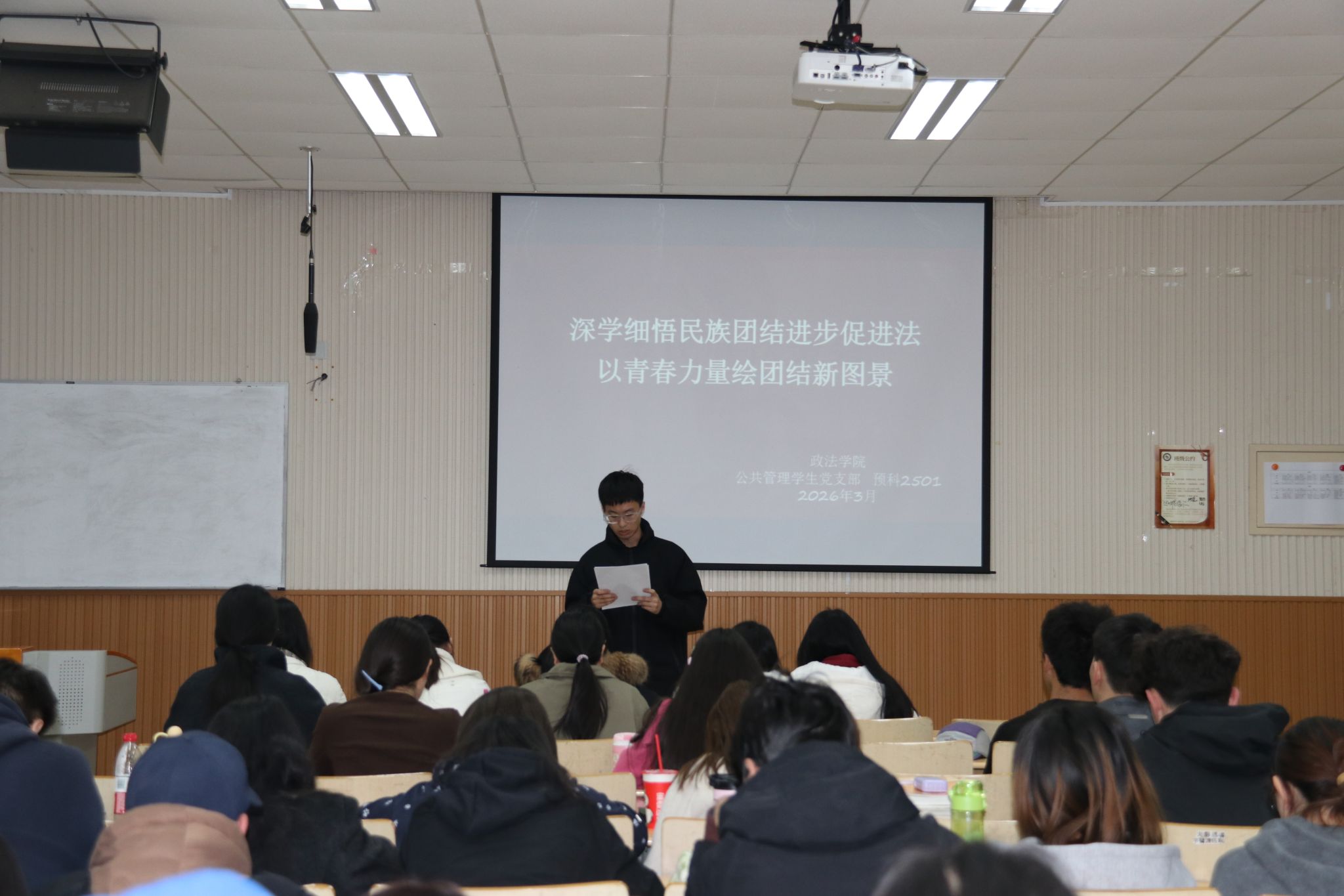 老师带领同学们研读了《中华人民共和国民族团结进步促进法》全文重点章节,围绕立法背景、核心要义与时代意义展开深入解读;深刻阐述了民族团结进步法治建设的时代价值,这部法律的出台不仅为新时代民族团结进步事业提供了坚实的法治保障,更为校园里的各族同学交往交流交融指明了方向;在校大学生是民族团结的生力军,要将法律条文内化于心、外化于行,在日常学习生活中做到彼此尊重、相互包容,用青春活力构筑中华民族共有精神家园。讨论环节,学生代表纷纷发表了学习心得,大家进一步明确了将铸牢中华民族共同体意识贯穿教育全过程的重要性。