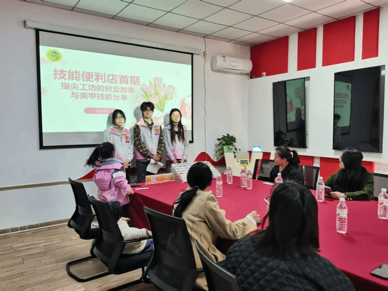 2023级社工专业卢冠希、杨亦非、胡嘉仪三名实习生联合槐荫区积成社成功开展首期“技能便利店”系列活动——“指尖工坊的创业故事与美甲技能分享”。本次活动共有10位女性创业者积极参与。