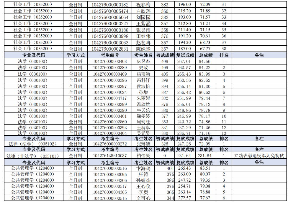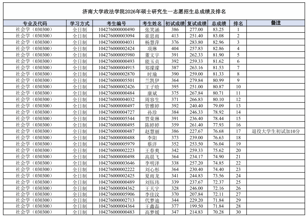 2026年硕士研究生复试录取工作方案》的相关要求和部署,学院于2026年3月23日至3月24日进行了社会学(030300)、社会工作(035200)、法学(030100)、法律(法学)(035102)、法律(非法学)(035101)、公共管理学(120400)硕士研究生招生一志愿批次复试工作。现将考生成绩及排名予以公示。