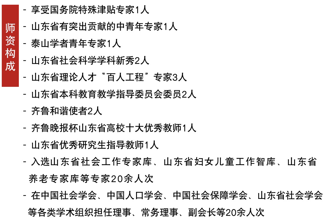 学院拥有教职工121人,其中专任教师111人,教授22人、副教授43人、具有博士学位教师68人,研究生导师63人。拥有享受国务院特殊津贴专家、山东省有突出贡献的中青年专家、泰山学者青年专家、山东省理论人才“百人工程”专家、山东省社会科学学科新秀、齐鲁和谐使者、齐鲁晚报杯山东省高校十大优秀教师等省部级专家20余人次,在中国社会学会、中国社会保障学会、中国法学会法学教育研究会、中国法学会宪法学研究会、中国法学会外国法制史研究会、山东省社会学会、山东省法学会等各类学术组织担任理事、常务理事、副会长等30余人次。