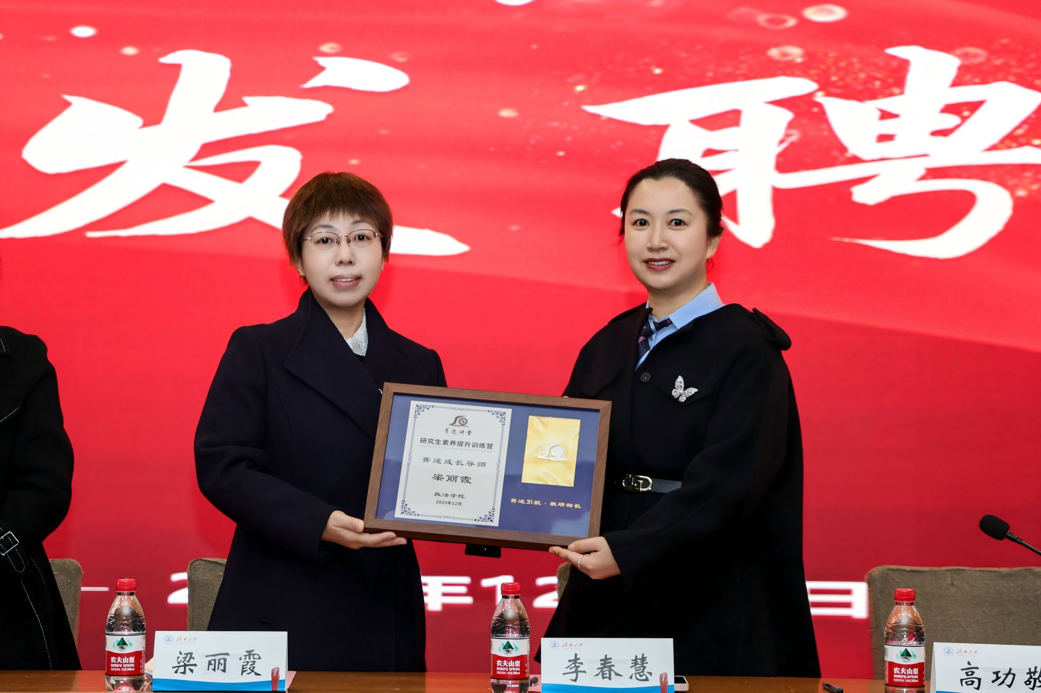 学院党委书记李春慧为山东省优秀研究生导师梁丽霞教授颁发“菁途成长导师”聘书,正式聘任其为“菁途讲堂”首批领航导师。