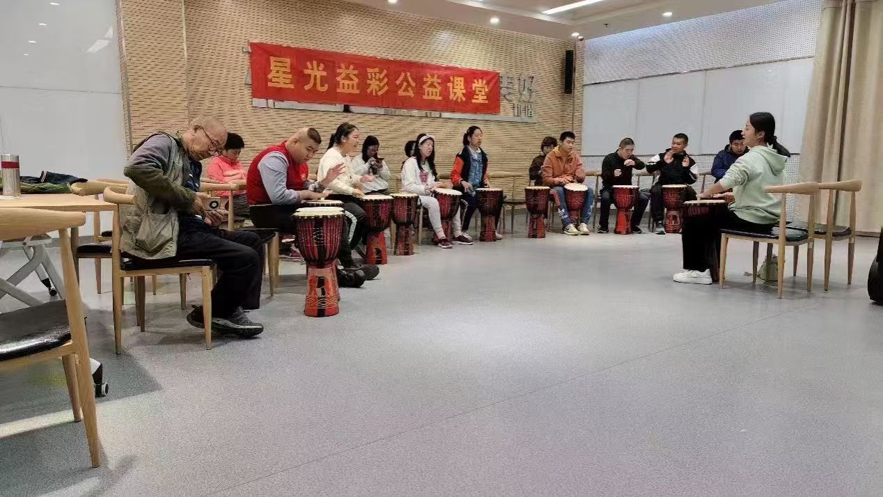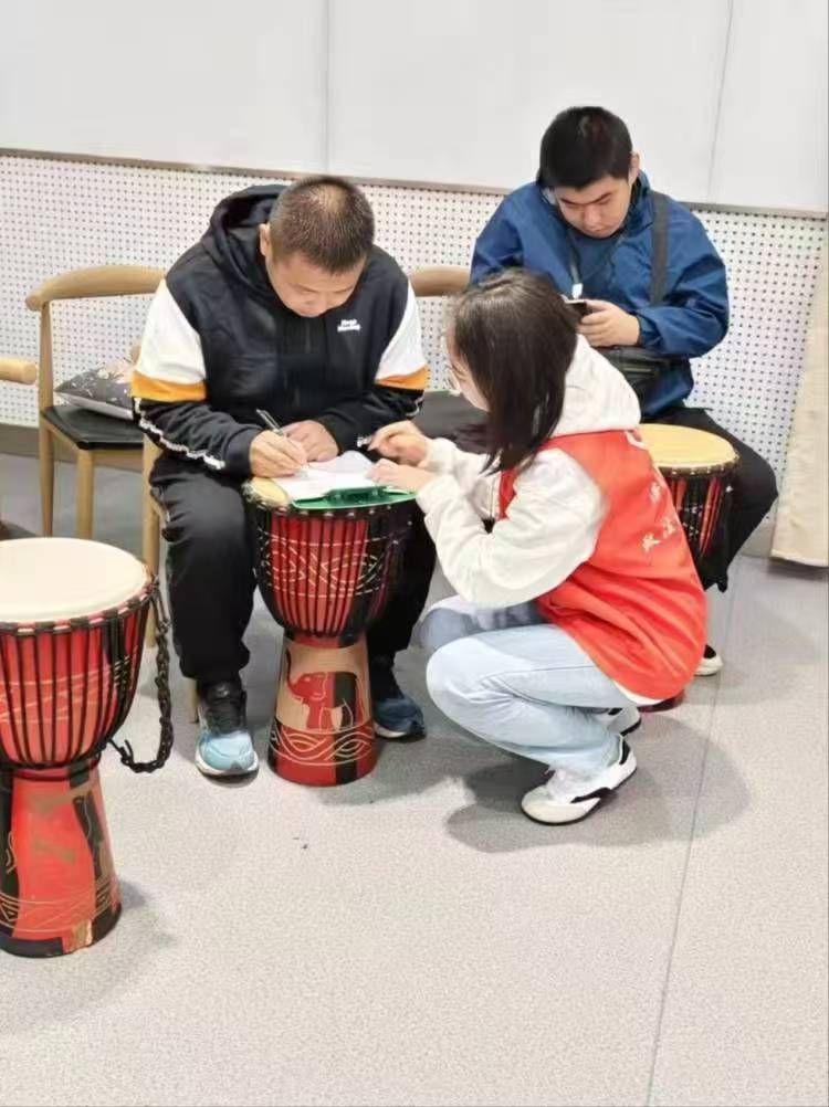 活动伊始,志愿者们认真负责地协助学员们签到,并引导他们走到指定地点。在专业老师教授非洲鼓的过程中,志愿者们陪伴在学员身边,为他们答疑解惑,鼓励学员们勇敢尝试。活动现场,志愿者们用他们的热情与爱心,为这个特殊的课堂注入了更多活力。学员们在老师和志愿者的鼓励指导下,逐渐掌握了非洲鼓的演奏技巧,在鼓面上敲击出欢快的节奏,演奏非洲鼓的趣味性让他们的脸上洋溢着笑容。志愿者们也时刻关注着学员们的动作,当有学员遇到困难时,志愿者们会用温暖的笑容和坚定的眼神表示鼓励,耐心指导,给予学员们信心和勇气。残疾人朋友们在学习和演奏非洲鼓的过程中积极展示自己,享受着音乐的趣味。在这个充满爱的公益课堂里,志愿者们用关爱和理解温暖着慧爱基地学员们的心,用尊重和包容拓宽他们的视野。