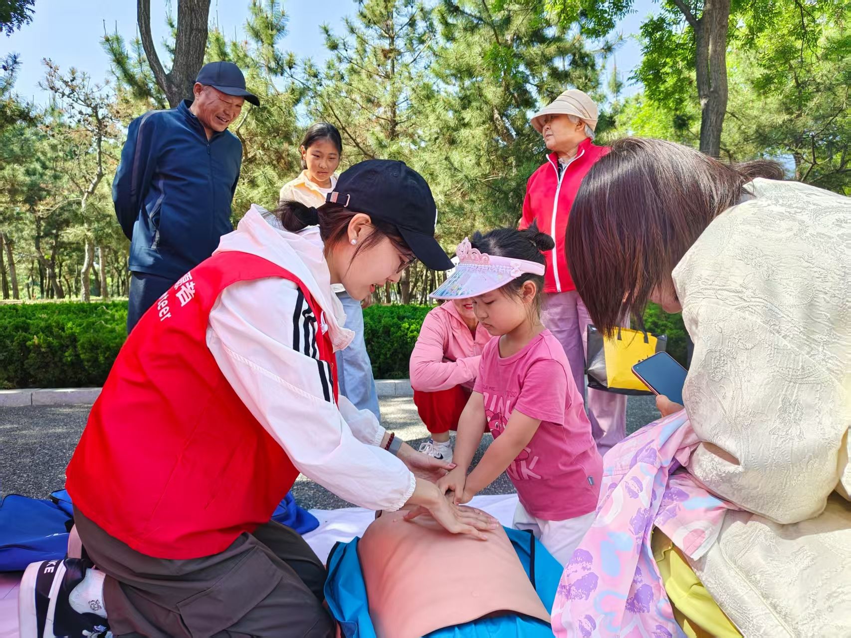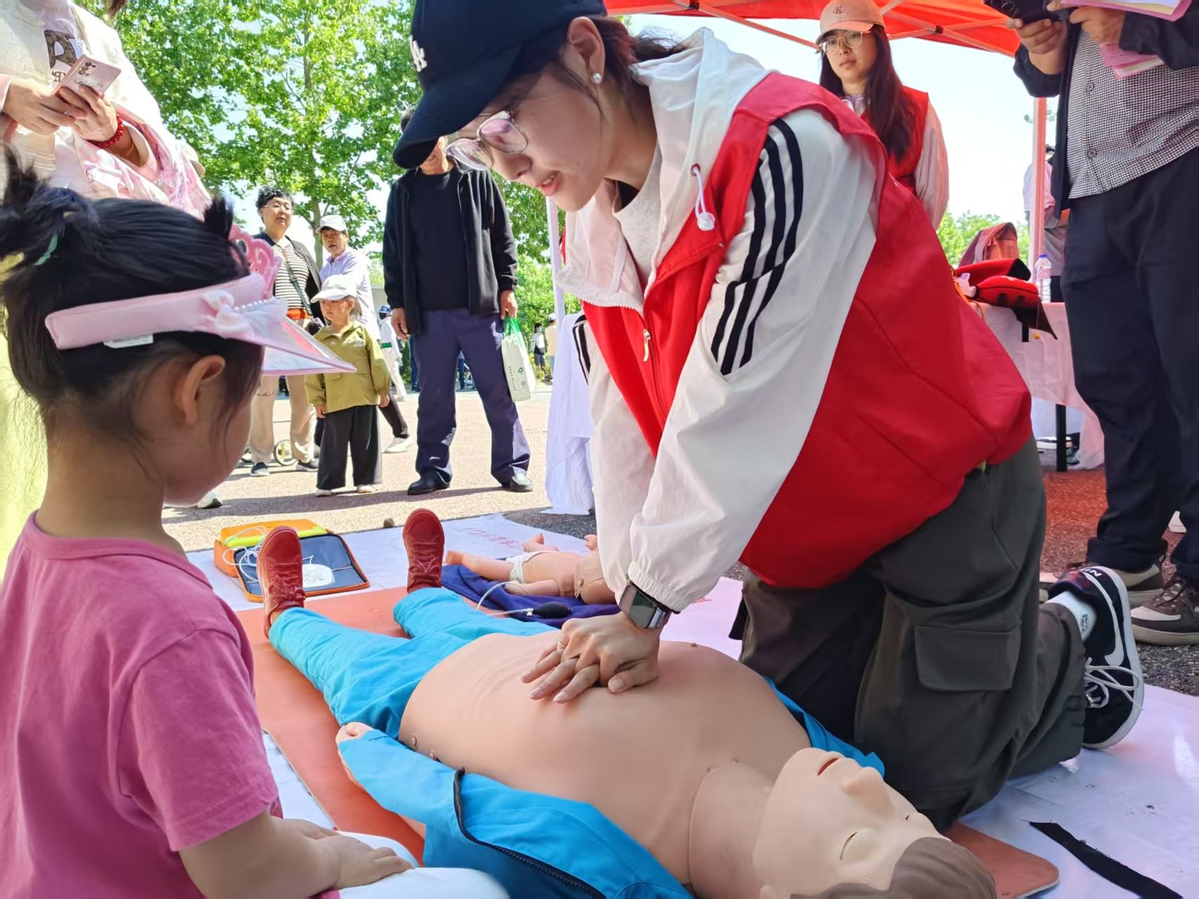 2022级社会工作专业实习生协同龙口市社会工作协会,于龙口市黄县林苑景区举办“赶大集”主题公益活动。活动伊始,实习生团队即高效完成物资调配、场地布置等筹备工作,为活动开展提供坚实保障。活动现场,社会工作机构依托专业资源,设立医疗急救知识科普实践专区,在专业急救员的指导下,实习生运用仿真教具,围绕心肺复苏术、人工呼吸操作规范、海姆立克急救法等核心内容,面向全年龄段市民开展系统性教学,并针对成人与婴儿急救操作差异进行专项演示,以标准化、规范化的教学流程,为市民打造专业化应急救护培训课堂。